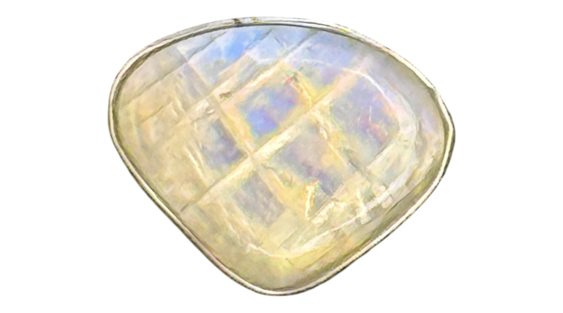 Mystical and luminous, this Rainbow Moonstone ring shimmers with flashes of blue, gold, and rainbow fire that dance across its milky surface in the light. Revered since ancient times as a stone of intuition, protection, and new beginnings, Rainbow Moonstone is said to balance emotions, heighten psychic awareness, and connect the wearer to lunar energy. Each stone is naturally unique, with its own play of color and glow.
