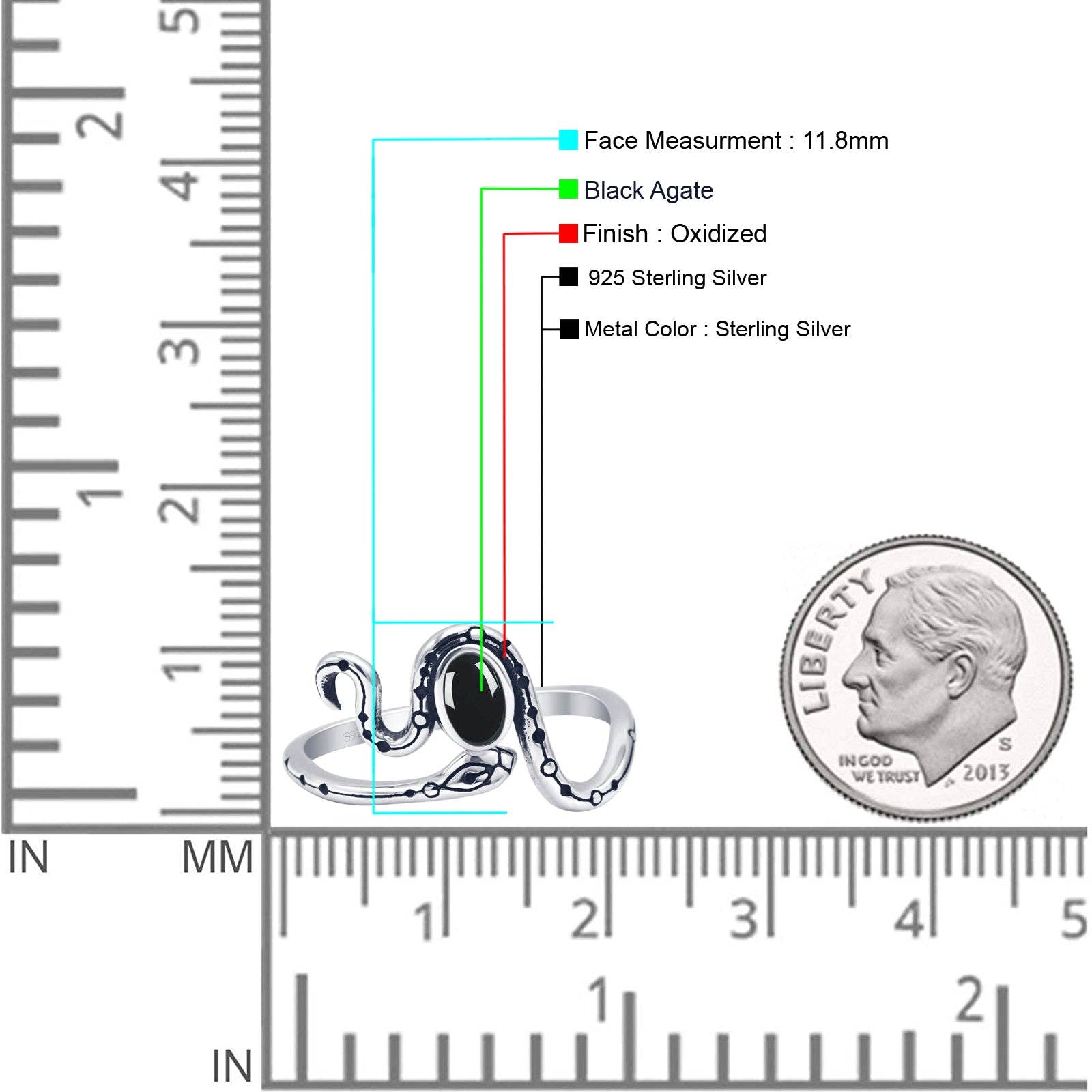 Slither into style with this enchanting Snake with Black Agate Egg Ring. Crafted from genuine .925 sterling silver with an oxidized finish for that mysterious allure, this piece features a striking oval black agate stone (11.8mm) cradled by an elegant serpent design. The simulated agate gleams with deep, mesmerizing beauty while the hallmarked sterling silver ensures lasting quality. Perfect for those who embrace the mystical and unconventional—a conversation starter that whispers secrets of the cabinet of curiosities. Open design makes this ring slightly adjustable.