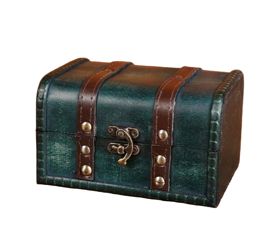 Unlock the charm of yesteryear with this delightful vintage wooden chest! Measuring a perfectly petite 6.25"L x 3.75"H x 4.75"W, this emerald-hued treasure box is ideal for stashing jewelry, trinkets, love letters, or whatever whimsical wonders you wish to keep close. The weathered wood whispers tales of adventures past, while its compact size makes it the perfect accent piece for shelves, desks, or nightstands. A curious little keeper of secrets!
