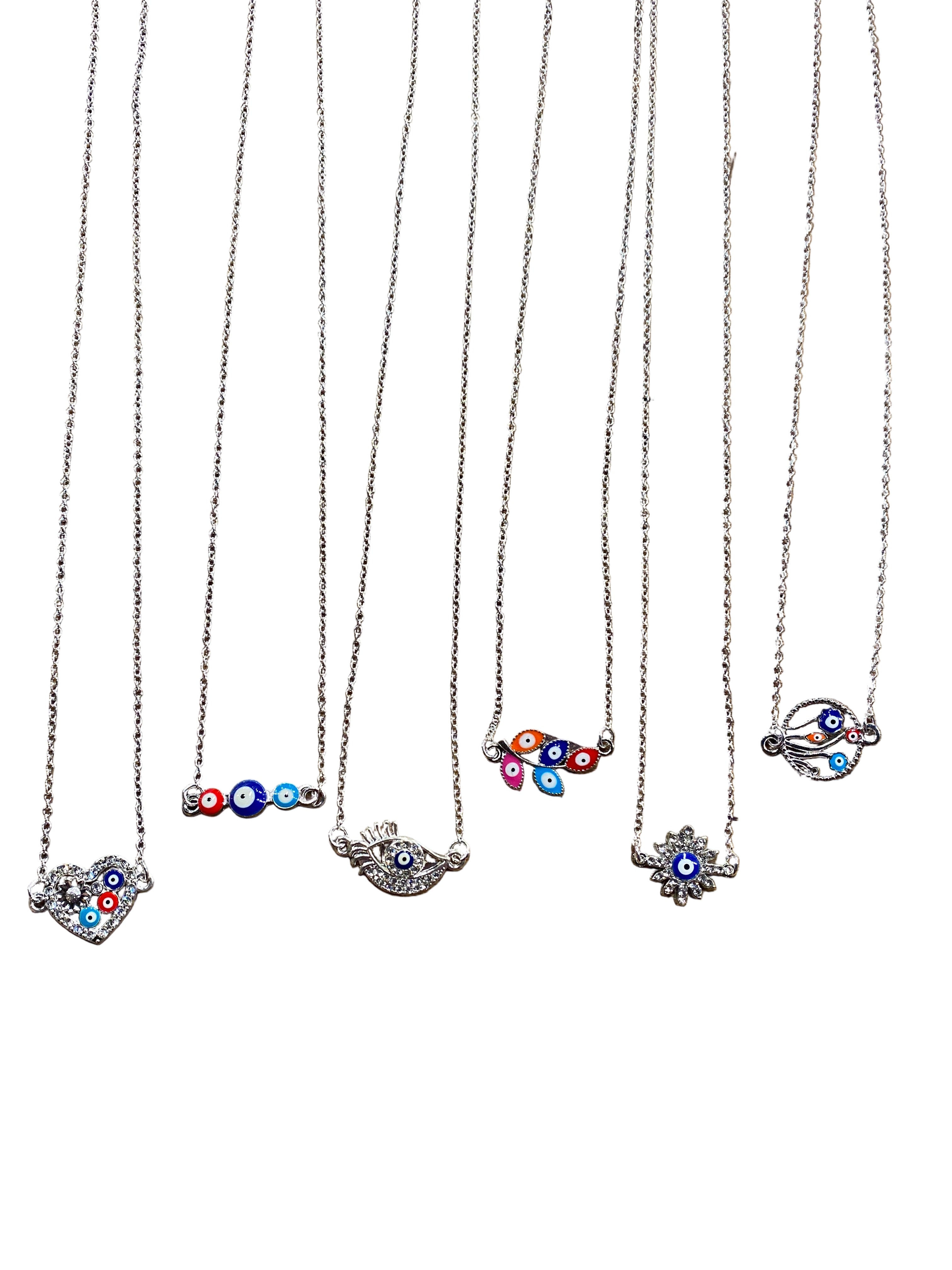 Indulge in some mystical charm with our Evil Eye Silver-Toned Necklace. Each necklace features a unique design, chosen at random, and offers protection from negative energy. Embrace your bohemian side with this versatile accessory!