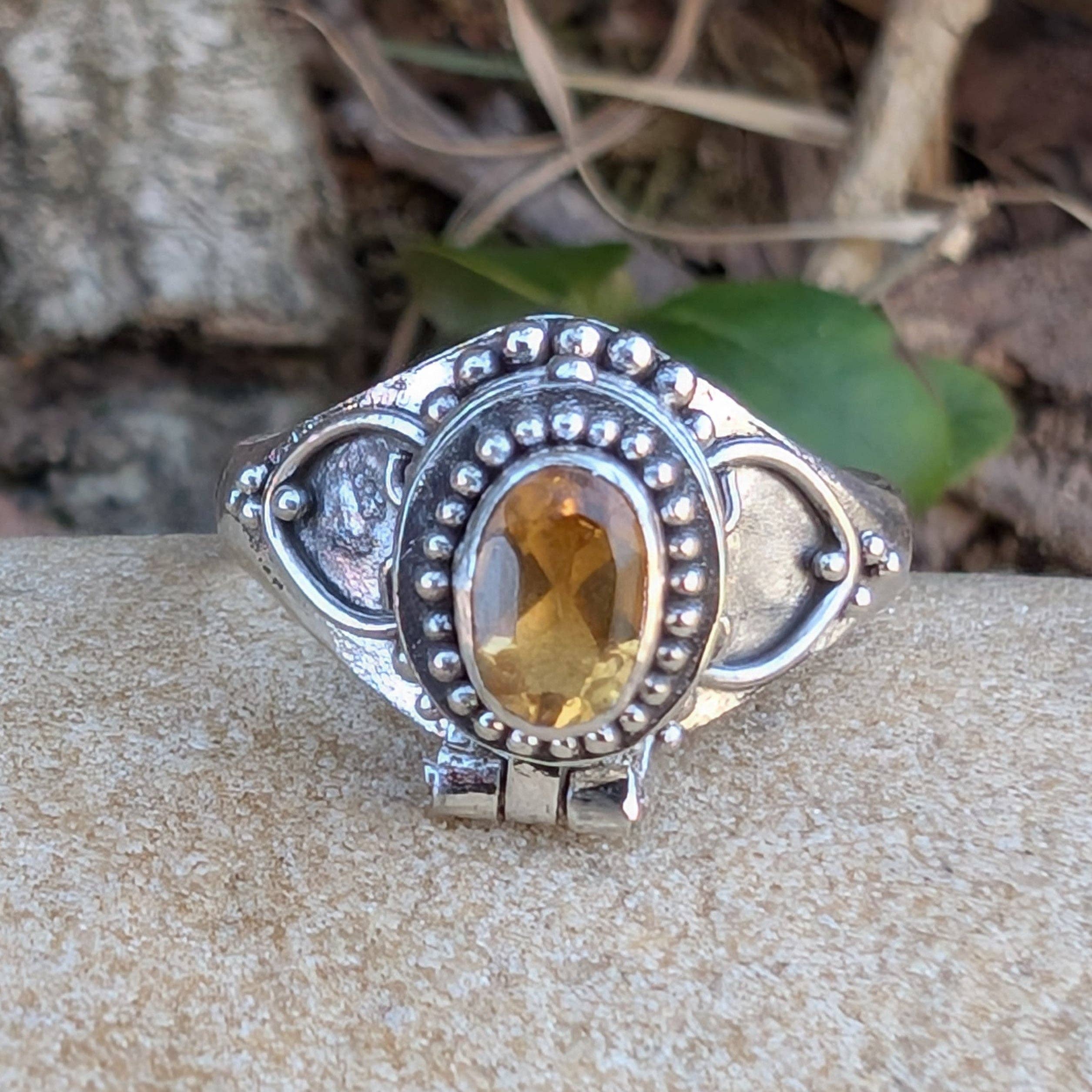Unlock a touch of gothic intrigue with this sterling silver poison ring, featuring a genuine oval gemstone (4x6mm) set in a gleaming 925-marked band. The hinged compartment opens to reveal a secret chamber—perfect for stashing tiny treasures, handwritten wishes, or sentimental keepsakes. Weighing approximately 3.5 grams with a half-inch face, this conversation-starting piece blends Victorian mystique with modern whimsy. A delightfully mysterious accessory for collectors and curious souls alike.